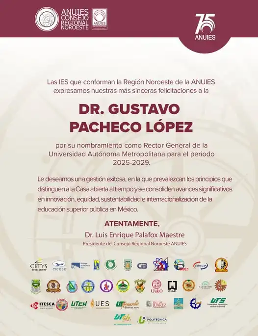 El Consejo Regional Noroeste expresa sus más sinceras felicitaciones al Dr. Gustavo Pacheco López por su designación como rector de la UAM Universidad Autónoma Metropolitana. Le deseamos el mayor de los éxitos en esta nueva etapa y confiamos en que su gestión contribuirá al fortalecimiento de la educación superior en nuestro país.