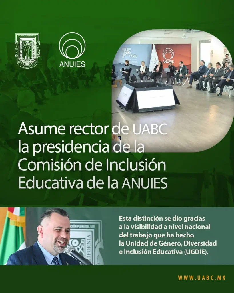 La Universidad Autónoma de Baja California se enorgullece de compartir que, gracias al trabajo realizado por la Unidad de Género, Diversidad e Inclusión Educativa (UGDIE), el rector ha asumido la presidencia de la Comisión de Inclusión Educativa de la ANUIES.