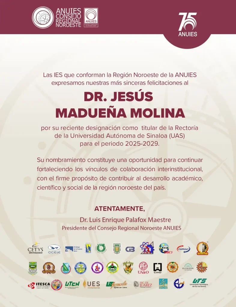 Expresamos nuestras más sinceras felicitaciones al Dr. Jesús Madueña Molina por su designación como rector de la Universidad Autónoma de Sinaloa para el periodo 2025-2029. Nos entusiasma la oportunidad de continuar colaborando en la construcción de una educación superior sólida y de excelencia para nuestra región.